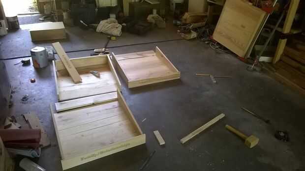 Utilizando las pinzas para madera, pegamento y galletas, armar frentes, partes posterioras y lados, prestando atención a la Plaza y la alineación de la ranura en tres lados. Deslice las planchas del tablero en uno por uno con pegamento en el frente y placas intermedias. No pegar a los lados o en la espalda.