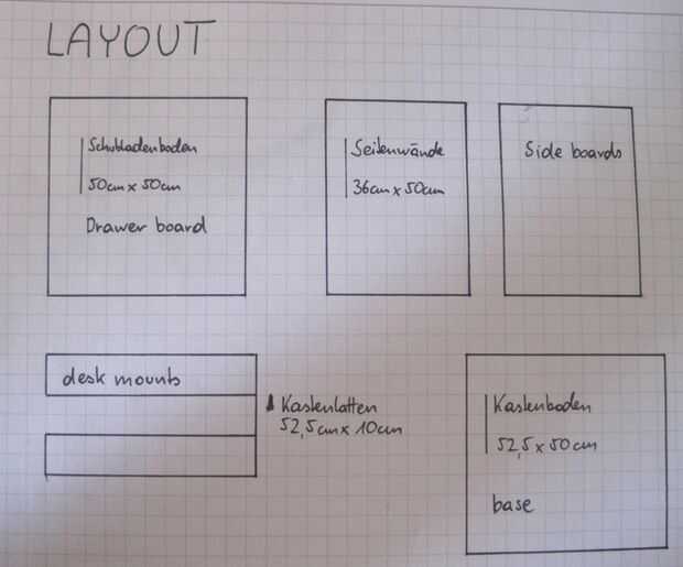 Ejemplo: Espesor del montaje del carril: 1,2 cm -> 2,4 cm; Ahora tengo que cortar el tablero 52,5 cm por 50 cm y los montajes de 52,5 cm por 10 cm