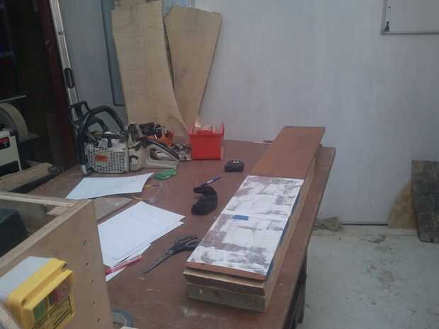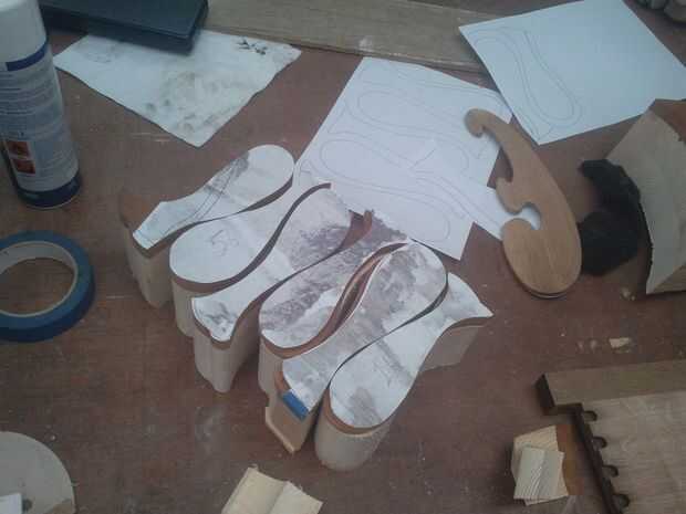 Una vez que feliz imprimí el diseño dejando un traslapo entre las hojas. Entonces pegué hasta algunos madera laminada había preparado (voy en ese divertido en el video). No lo hice y use un adhesivo aerosol que no siempre quiere quitarse - aumenta el lijado requerido!