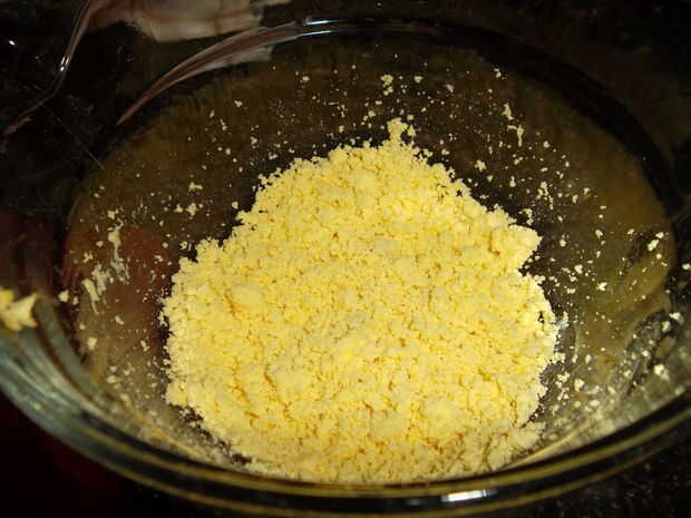 Horquilla uso para romper las yemas en trozos pequeños que se asemejan a las migajas.  Es mucho más fácil de ver que tienes todos las yemas rotas para arriba si lo haces antes de agregar los demás ingredientes.