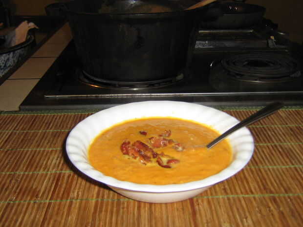 Ayer hice esta sopa muy sabrosa. Sirve esta deliciosa sopa con calabaza salado y pan de queso feta. Usted no puede ir mal con esta combinación. Es como una comida en sí mismo. Bonito para algunos buena mantequilla real sobre las rebanadas de calabaza