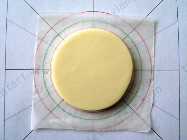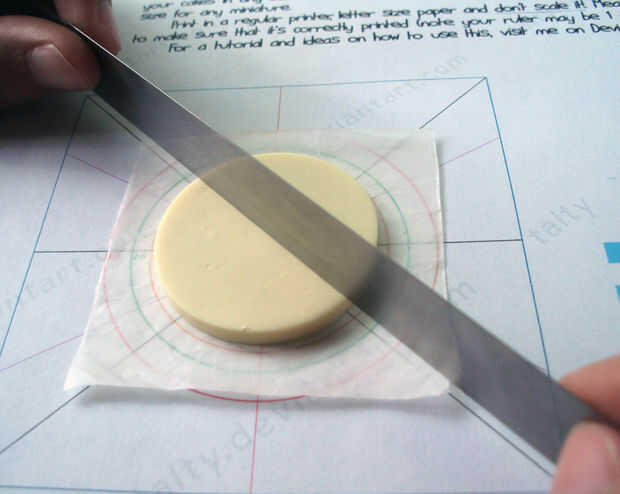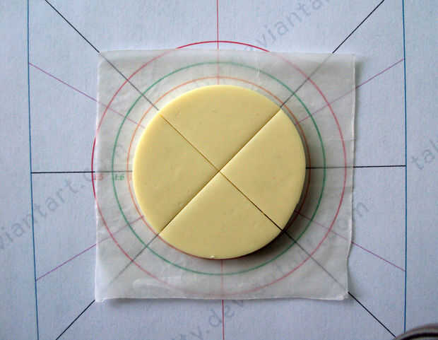 Coloque su círculo de arcilla sobre la plantilla y centro al círculo más cercano o a escala y use una hoja recta para cortar siguiendo las guías. Me gusta hacer mis tortas en ocho rebanadas, pero algunas personas prefieren seis. Puede hacer cualquiera con los guías.