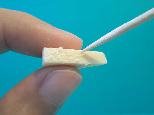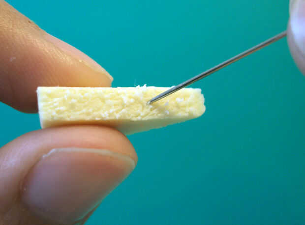 Primero tomar un palillo de dientes y raspar la superficie en cualquier movimiento aleatorio. Estamos haciendo una pre-textura áspera, así que no necesita ser perfecto. A continuación, utilice una aguja y rayar ligeramente la superficie en círculos pequeños, esto lograr la textura de la torta. No apuñalarlo! Los agujeros no se ven naturales. Eliminar arañazos duros y todo lo que se ve raro.