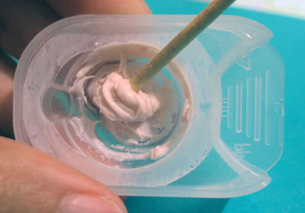 A continuación, squirt algunos TLS u otro tipo de arcilla de polímero líquido y mezclar juntos. Todo lo que tienes alrededor utilizar: un palillo, un palillo de dientes, lápiz, etc.. Asegurar el conseguir una consistencia para untar, si es demasiado fina añadir más arcilla y viceversa. Puede tomar varios minutos de mezclar, pero sea paciente.