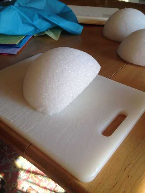 Corte las bolas a la mitad. Yo no era capaz de cortar con el cuchillo Xacto. Usé un cuchillo de pan grande con una hoja dentada. Entonces, yo en forma de un triángulo de la bola para formar una abertura cuando pone plana.