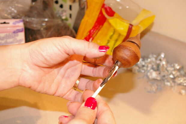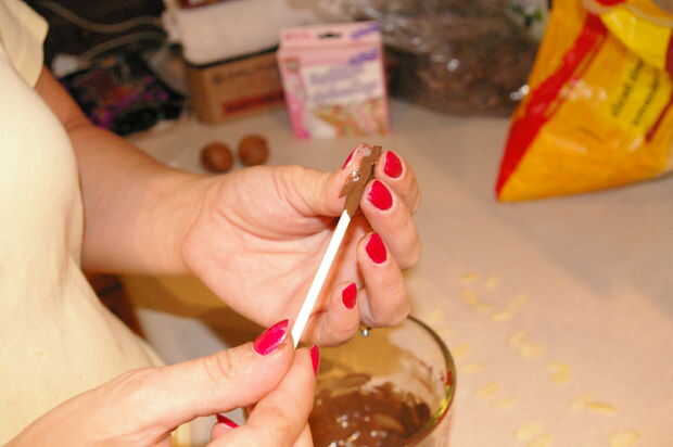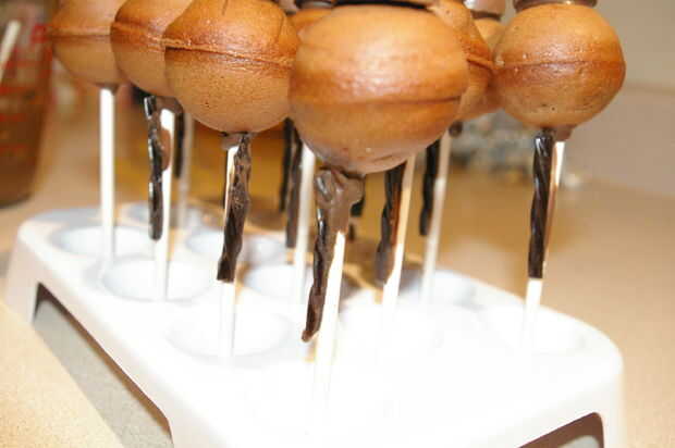 5. use derretido chocolate para regaliz para pegar en la base de la torta pop.