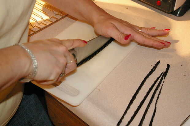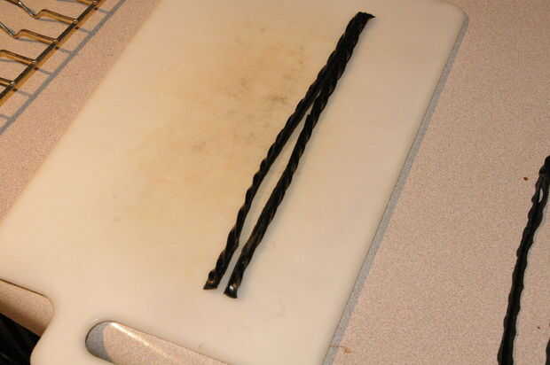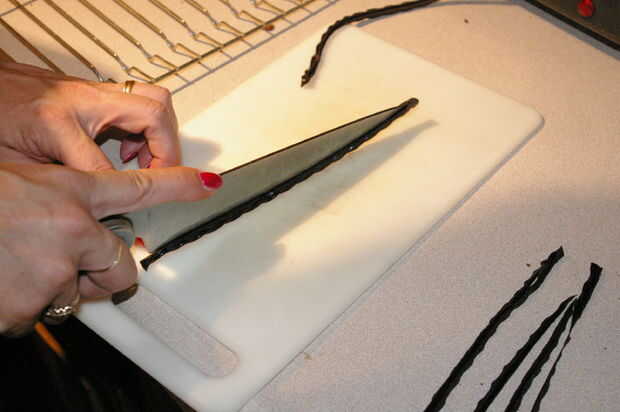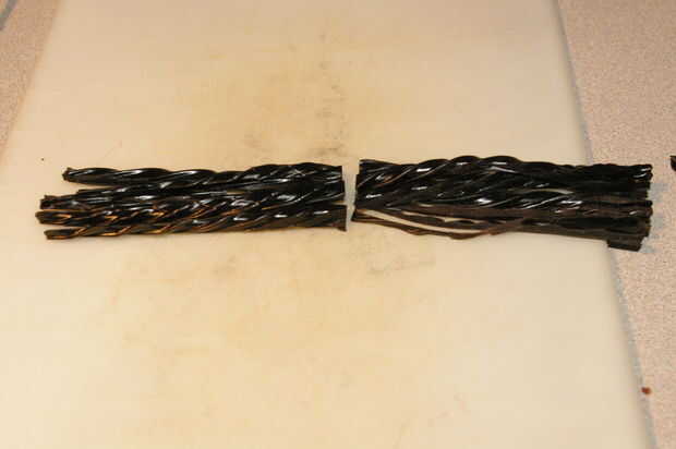 1. prepare sus colas de regaliz. Regaliz de cortar por la mitad a lo largo y luego cortar cada pieza por la mitad a lo largo otra vez (esencialmente los cuartos). Corte en piezas de aproximadamente 1" a 1 1/2" de largo. Esto hace de ellos bueno un fino