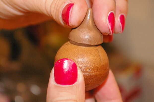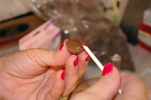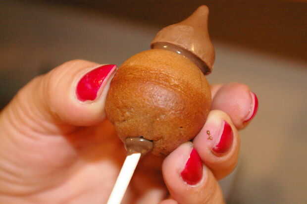 4. Desenrolle Hersey Kiss y sumergir la parte inferior plana en el chocolate derretido. Colocar sobre una torta pop enfrente del palillo.