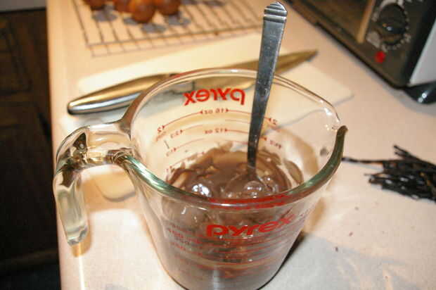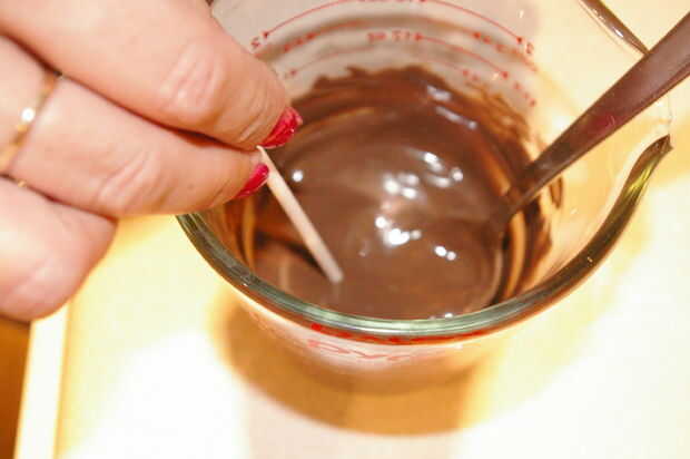 2. Coloque aproximadamente 1 taza de chocolate obleas fusión en un taza medidora de vidrio. Microondas en alto por 30 segundos. Revolver. Si es necesario reemplazar en microondas y calentar durante 15 segundos. Revolver.