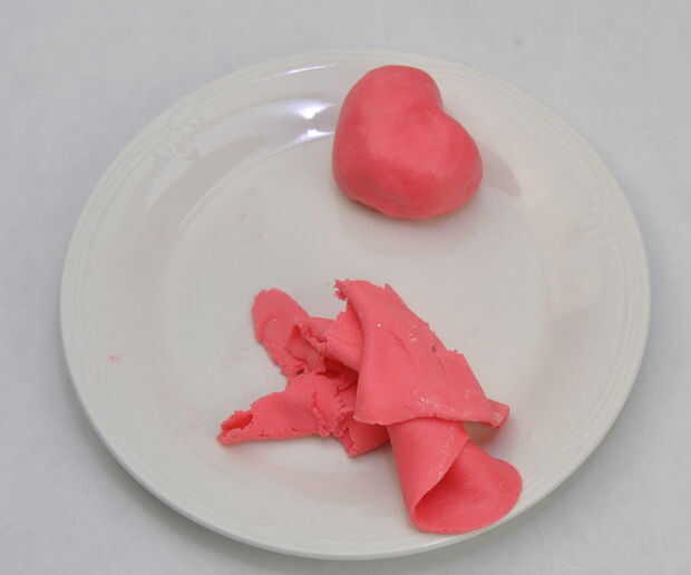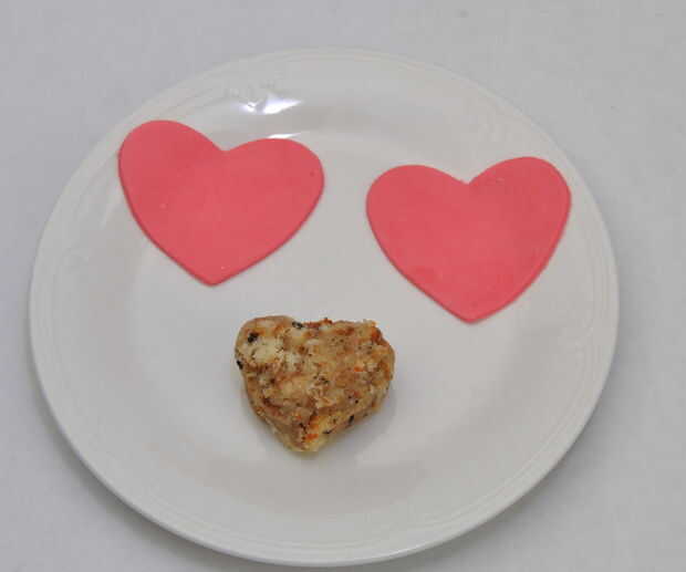 Usando el tamaño siguiente para arriba del cortador de la galleta, cortar dos corazones en fondant. Entonces esta envuelto alrededor del corazón. Creo que esto habría funcionado muy bien excepto el baño en la parte superior de los corazones no cumplió muy bien en la parte superior del corazón.