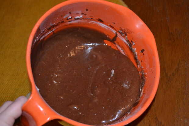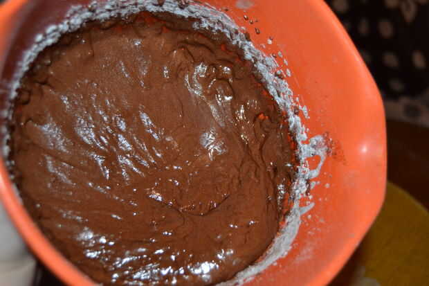 Luego agregar la harina, agua, aceite, polvo de hornear y cacao.