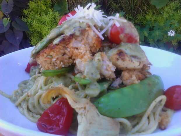 Para preparar esta comida que usualmente uso tortas de cangrejo 2 por placa.. .por persona... tan caliente su tienda compró pasteles de cangrejo o preparar su propio sin embargo desea. Conseguir que el punto de que sólo puede ser zapped en el horno cuando esté listo para poner en el plato de pasta. Calor y drenaje su pasta como normalmente lo haría con cualquier pasta para cualquier comida de pasta... preparar tus verduras, chícharos y pimiento a tu gusto. La pasta de cabello de Ángel va en la placa primero luego construirlo cómo le gustaría. Yo no pasta crabcakes y luego tipo de colocar las verduras y alcachofas en el plato. Entonces siguiendo con nuestra propia receta de pesto de espinaca y aceite de oliva que se puede comprar en la tienda y también es muy sencillo de hacer en casa :)