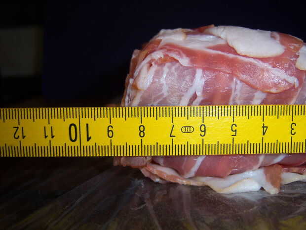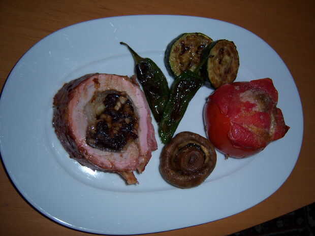Es un lomo de cerdo relleno con ciruelas y cebollas y envuelto en un trenzado de tocino fino.