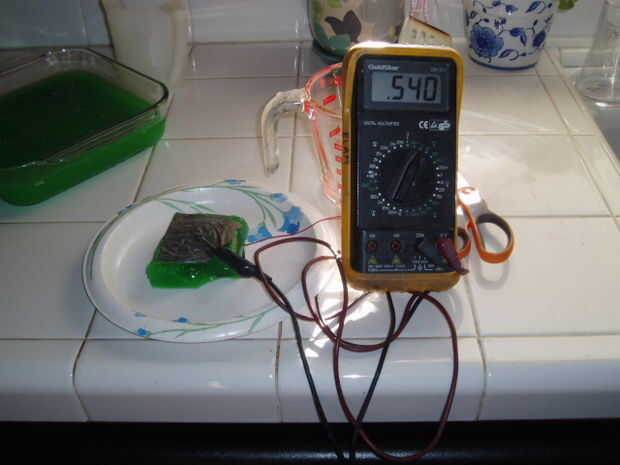 Así es como funciona, vamos a mezclar una poco marca Jello gelatina instantánea con levadura activa de algunos Fleischmann y unas gotas de planta de alimentos. Una vez que solidifica vamos a cortar un buen rato Jello plazas (sí, aún agitan) y, usando el papel carbón como electrodos, vamos a aprovechar la energía producida por la levadura para crear electricidad.