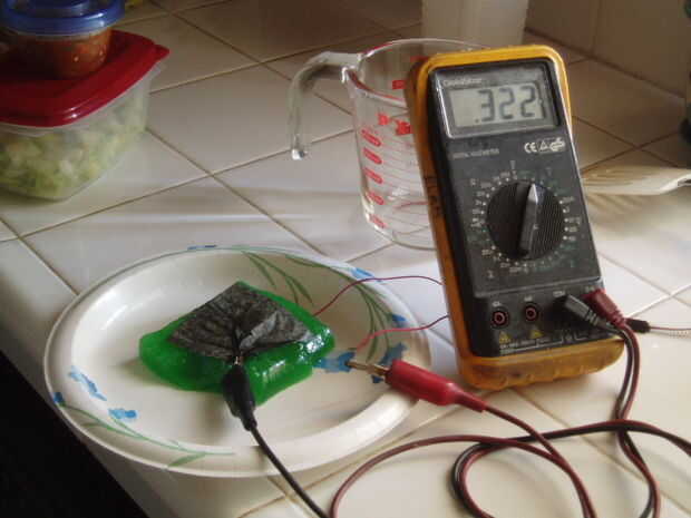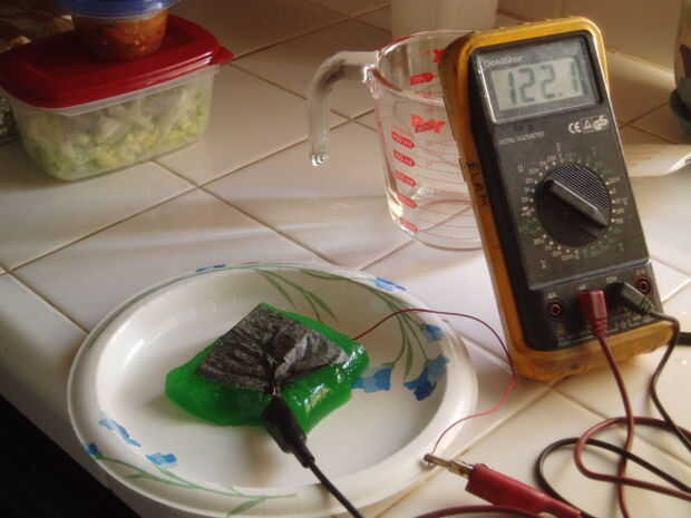 Conecte un cable de tu MM al plomo del ánodo, conectar el otro al cátodo. Como se puede ver en la imagen de la intro tengo una lectura inicial de aproximadamente 500 mV que posteriormente se ha reducido a cerca de 280 mV en un circuito abierto.