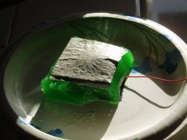 Lugar que más o menos cuidadosamente sobre el montaje del ánodo. Ahora coloque el otro trozo de papel encima de la Plaza de gelatina. Este es el cátodo.
