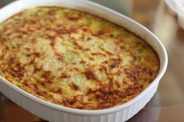 la parte más difícil de este plato es averiguar lo que llamarlo! Es como un quiche que cayó en budín de pan.Estoy acostumbrado a cocinar para una familia grande de hambre, pero todos han crecido y avanzado por lo que estoy tratando de cocinar porcion