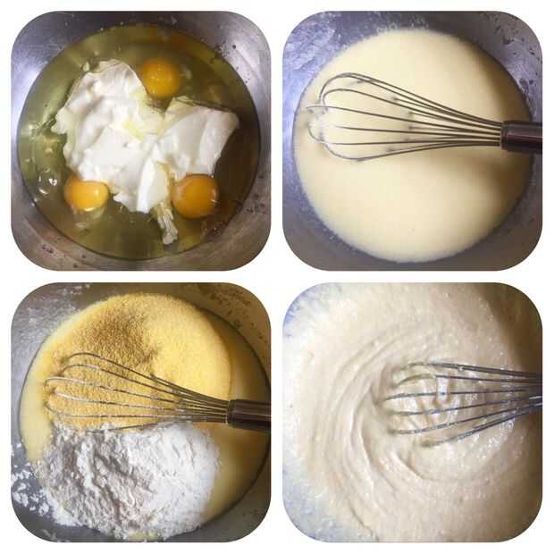 • Añadir la harina de maíz, el flujo y el polvo de hornear y mezclar bien