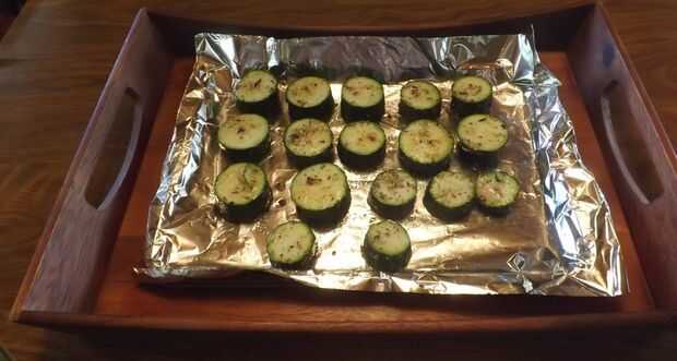 4. Distribuir las rodajas de calabacín sobre la bandeja para hornear