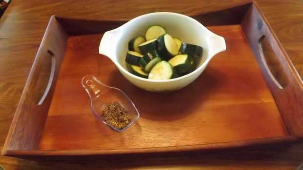 2. Cortar el calabacín en rondas de 1/2" y mezcle con las 2 cucharadas de aceite de ajo