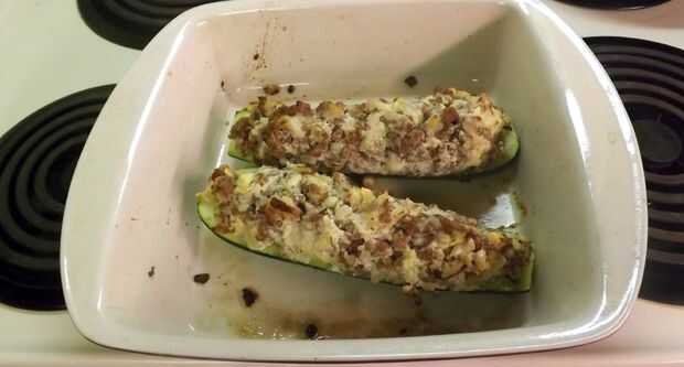 CALABACINES al horno rellenos de queso RICOTTA y la salchicha caliente (3 / 5 paso)