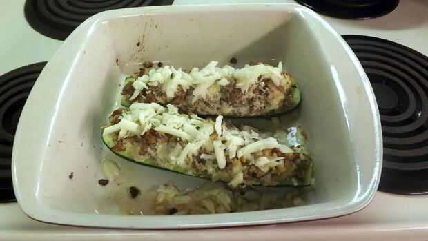 7. Quitar el plato de la parrilla; Apague la estufa y deje que los calabacines rellenos descansar durante un minuto o dos; luego deslice las cáscaras en un plato.