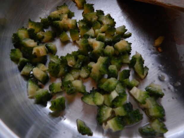 Caliente el aceite en una sartén. Añadir la calabaza amarga picada y escurrida. Saltear durante 10 minutos y mantener a un lado.