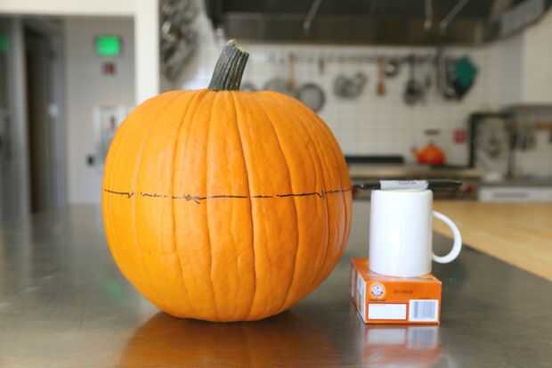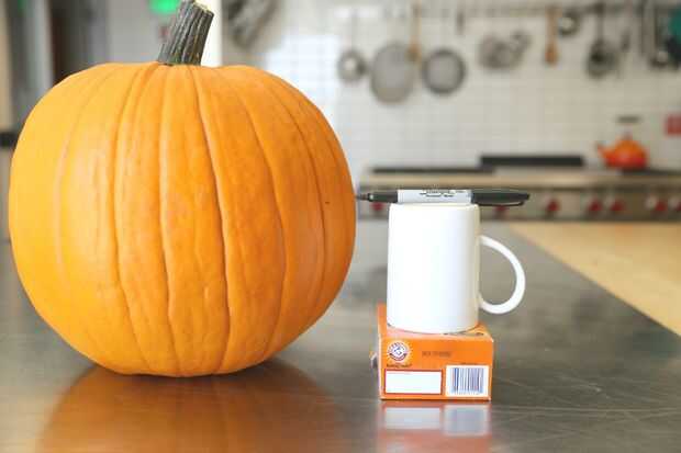Desde calabazas no son simétricas, encontrar la forma más sencilla de hacerlo es construir una torre estable de objetos de cocina que puede estar en el marcador y ha venido la punta donde usted desee marcar su línea. (como en la foto)