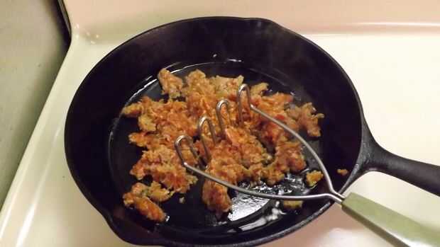 - Añadir el chorizo a la sartén caliente; Crumble y cocine hasta que ya no rosa (me gusta todavía usar mi antigua machacador crumble o carnes molidas de ruptura cuando les dorado). Ponga a un lado. Reduzca el calor de la cacerola a medio.