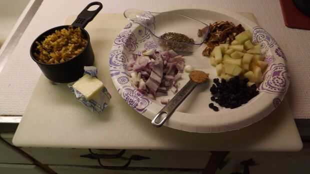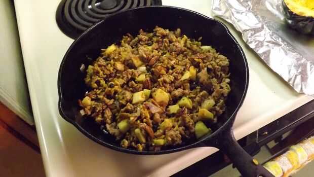 - Añadir el chorizo a la sartén; Agregue las manzanas, pasas, cebollas, nueces, hierbas y especias. Retirar el pan del fuego.