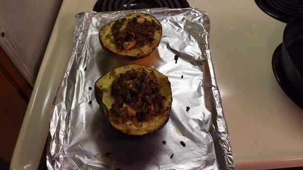 - Rellenar las mitades de calabaza con relleno; Presione hacia abajo y el relleno de la Lomita.