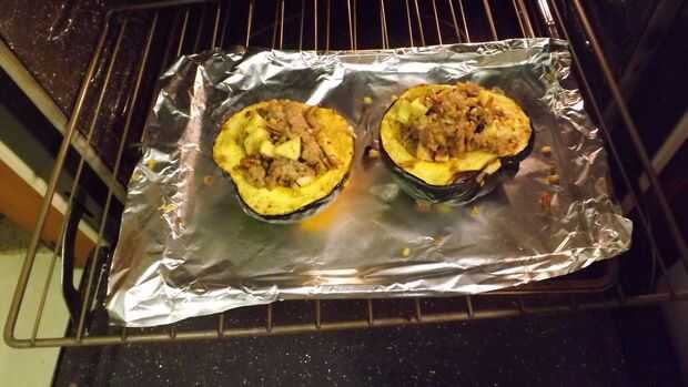 - Cocer las mitades de Calabaza bellota rellenas en el horno de 375 grados F durante aprox. 20 a 25 minutos o hasta que esté tierna la bifurcación.