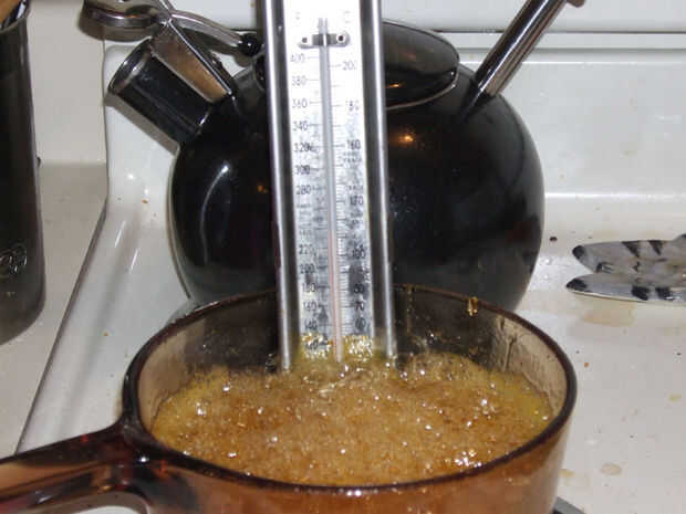 Mezclar el azúcar, el jarabe de maíz, miel, agua, sal y 1,5 cucharadas de puré de calabaza en una olla grande. Llevar a hervir sobre fuego alto, mezclando constantemente hasta que el azúcar se disuelva, luego no se mezclan después de eso. Si tienes cristales de azúcar formando en el lado de la olla (y probablemente será) lavar hacia abajo los lados de la cacerola con una brocha de cocina húmedo. Como alternativa, después de que termines revolviendo le puede poner una tapa en la olla. Esto permitirá que la condensación del agua que se evapora hacia abajo los lados de la olla y el azúcar se disuelva.