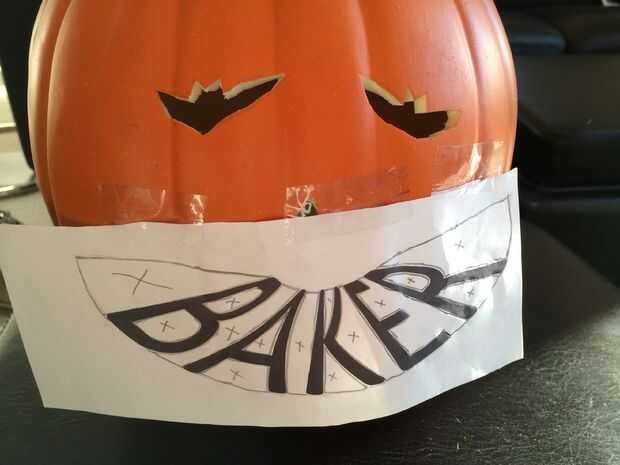 Recortar el papel un poco, por lo que es más fácil trabajar con. Línea de la boca donde usted lo desee y cinta de la parte superior de la misma en lugar de la calabaza; usted necesita ser capaz de diapositivas papel carbón (lado negro hacia abajo) por debajo de ella. Bosquejo alrededor de las letras y líneas. No hay necesidad de llenarlo, sólo asegúrese de obtener las líneas dentro de las letras, como los círculos en la B y de R Me pareció útil hacer una pequeña 'x' en las todas las áreas blancas, así que cuando se quita la plantilla está claro qué áreas necesitan para recortar. Usted no quiere cortar las letras reales hacia fuera, pero el área alrededor de las letras (y boca).