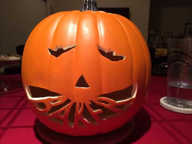 He añadido en una nariz de triangulo y los murciélagos para los ojos. (Lamentablemente puedo han puesto la boca un poco demasiado bajo... y los ojos un poco demasiado alto. Pude solucionarlo simplemente aumentando el tamaño de la nariz... pero se lo suficientemente cerca). Lo único habría cambiado es las esquinas de la boca, haciendo que la parte superior horizontal en lugar de seguir la curva hacia arriba (creo que los huecos en las esquinas de la boca sería de la mitad han sido tan alto, pero otra vez, lo suficientemente cerca).