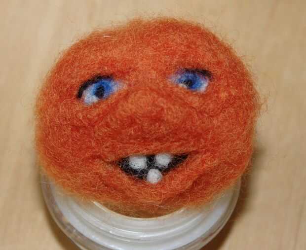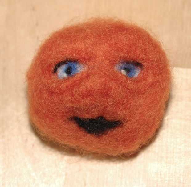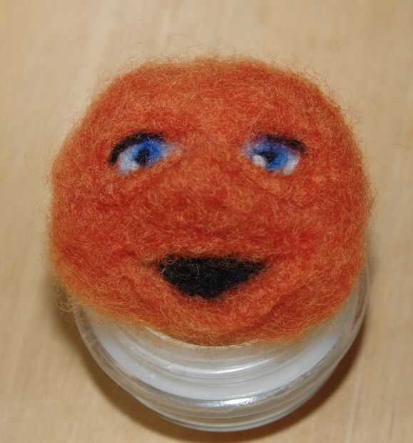 Hacer una aguja de tejer de una pulgada y media del rodillo y fije para hacer el labio inferior. Hacer lo mismo con un rollo de una pulgada más delgado para el labio superior. Forma para crear una sonrisa. Añadir un poco de lana para rellenar entre el labio superior y la nariz.