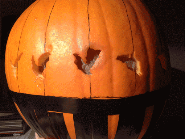 El mecanismo de esta calabaza es muy simple, caer en algún lugar entre un zoetrope y un proyector de la película. A diferencia de un zoetrope normal, donde usted tiene que mirar a través de una serie de rendijas para ver una imagen en movimiento, mi calabaza brilla una linterna externa hacia arriba a través de las ranuras para iluminar tripas de calabaza. Como la calabaza rota, sus interiores se encienden sólo cuando una de las ranuras se alinea con la linterna, haciendo que flash en el tiempo con los fotogramas de una animación tallados en piel de la calabaza.
