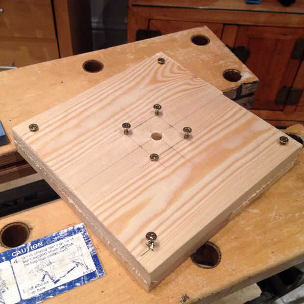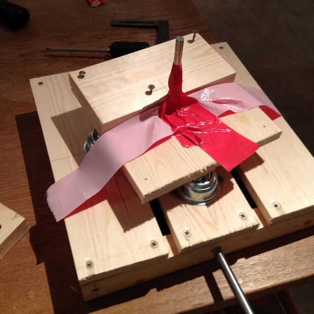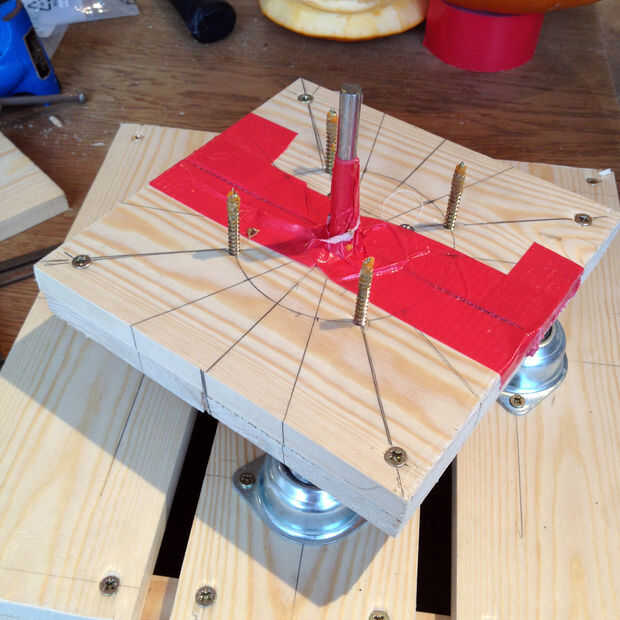 La plataforma en la que se encuentra mi calabaza realizó atornillando unos trozos de madera y cinta adhesiva les al eje central, manteniendo la cinta intercala entre las dos capas de madera. Esos cuatro tornillos hacia arriba peligroso aspecto son mantener la calabaza en su lugar.