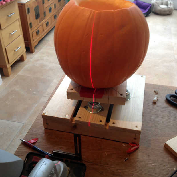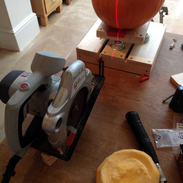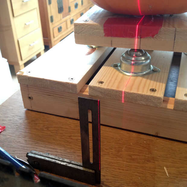 Ahora necesita la calabaza se dividen en segmentos verticales precisamente alineados. Si le sucede que tiene un laser capaz de proyectar una línea (por ejemplo, usted podría encontrar en una sierra circular o un machete de guiado por láser), después usted puede utilizar esto para ayudarte. De lo contrario, puede utilizar algo robusto con un ángulo recto y la mano firme.