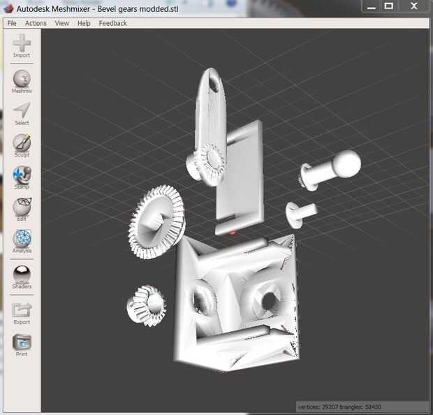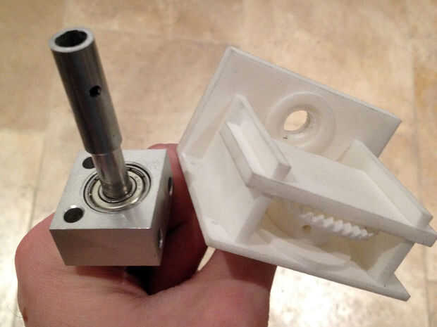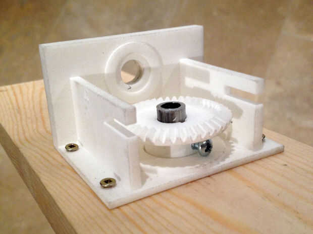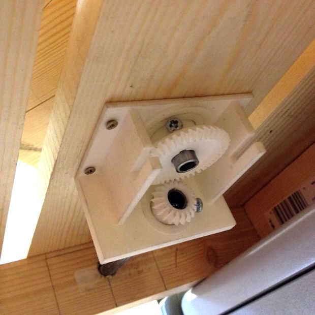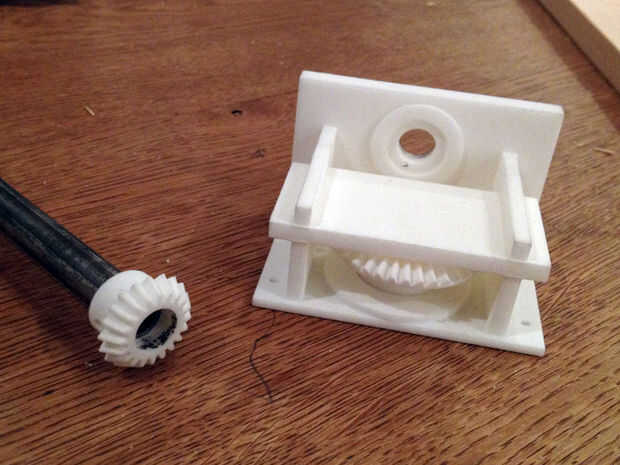Si usted tiene acceso a una impresora 3D, usted puede hacer el mismo par de engranajes cónicos que usé. He encontrado en línea en Thingiverse y añade un marco para mantener en su lugar. Puede utilizar mi archivo STL o el original de la cuenta de Thingiverse de staffert; Recuerde ajustar el tamaño para caber sus ejes.