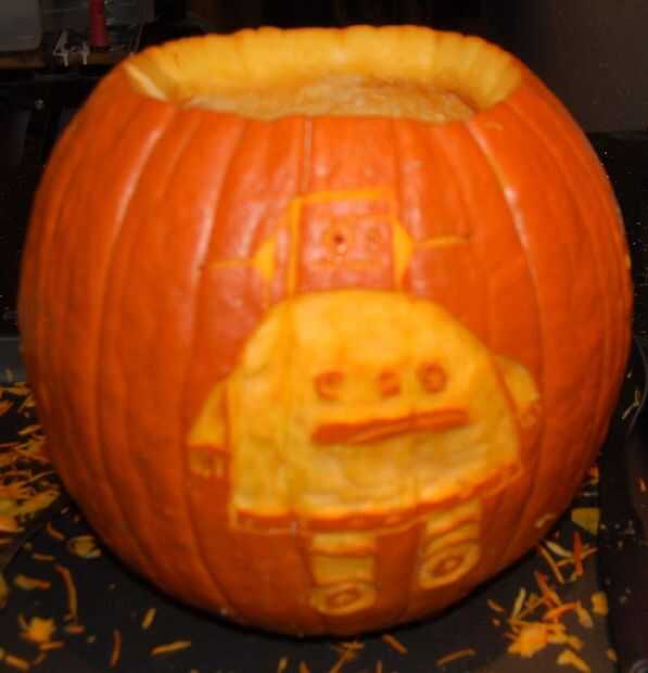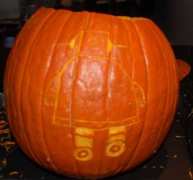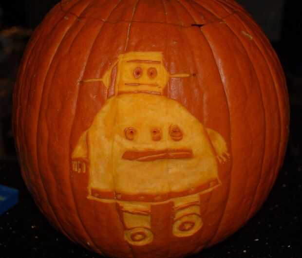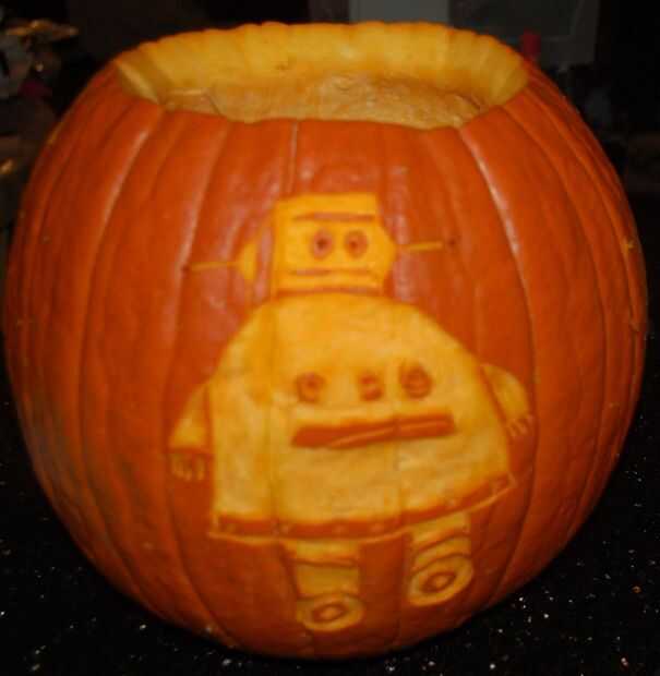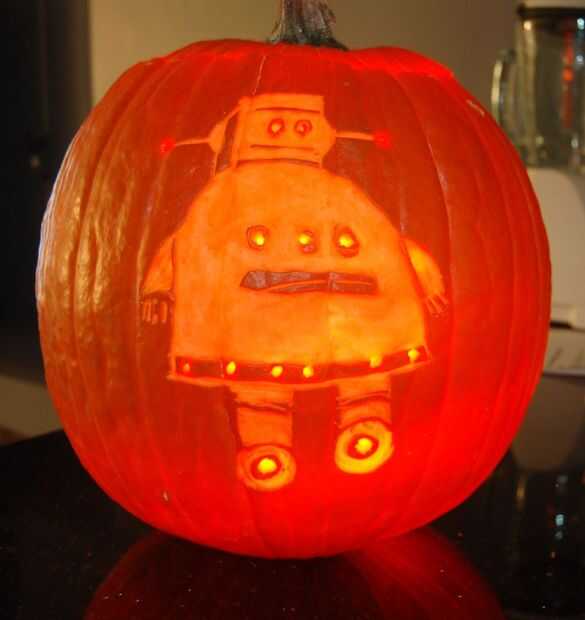 Usé una herramienta de talla de madera para quitar la piel oscura exterior de la calabaza dentro de las líneas dibujadas. Para líneas oscuras en el robot simplemente deje la piel en esas zonas. Para zonas muy ligeras o que quiera destacar tomar una brocheta de madera y empujar a través de la calabaza de la pared completamente esto permitirá más luz a través y hacer esa mirada punto muy ligero. Esto le da esencialmente 3 tonos de naranja: piel oscura, tallada a carne y luces de la luz penetra a través de. Esto sale especialmente bien para el logo del robot como el original es en realidad sólo dos colores pero realmente poder añadir las "luces" para los ojos y botones hace venir a la vida.