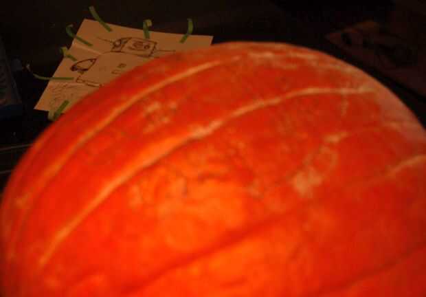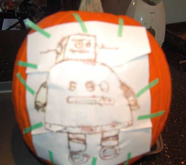 Para empezar he impreso de un dibujo del robot y pegadas a la calabaza. Entonces perforó la piel de la calabaza con un pequeño clavo a través del papel a lo largo de todas las líneas del dibujo tenía un esbozo de la robusteza en mi calabaza. Después de retira el papel se cubra la calabaza en una capa delgada de harina y frotar en los agujeros. Esto pondrá de relieve las áreas perforadas de la piel puede tomar un lápiz y dibujar las líneas en la calabaza pero une los puntos formando una copia de lo que estaba originalmente en el papel.
