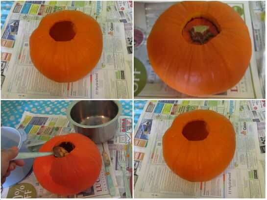 Después de nuestra plantilla está listo, es hora de limpiar la calabaza de adentro hacia fuera. En primer lugar, tendrá que cortar la parte superior de un círculo al azar. Quitar la parte superior que se revela un agujero con semillas en su interior. Ahora limpiar. Es fácil de limpiar la calabaza y utilicé una cucharada de helado de crema para quitar las semillas y otras materias de dentro de la calabaza. Luego, limpia la calabaza entera en un agua corriente y secar con un paño limpio.
