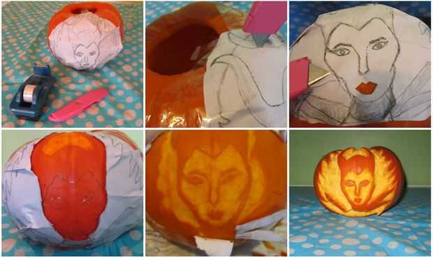 Después de crear nuestra plantilla, ahora es tiempo que anhelan lo mismo en nuestra calabaza. Para ello, pegué mi dibujo sobre la calabaza con la ayuda de la cinta de cello. Entonces, usando un cuchillo afilado lápiz que comencé a cortar a través del esquema lenta y firmemente.