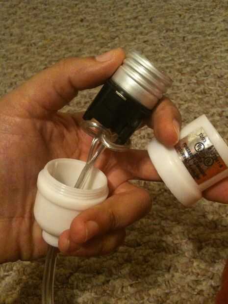 Luego corte el ojo toma los orificios. I Desenroscar el conjunto de mis bombillas y utiliza la parte superior de la misma para medir mi agujero. (Asegúrese de que los agujeros son lo suficientemente alejados para el gran final de las bombillas no se topar juntos!)