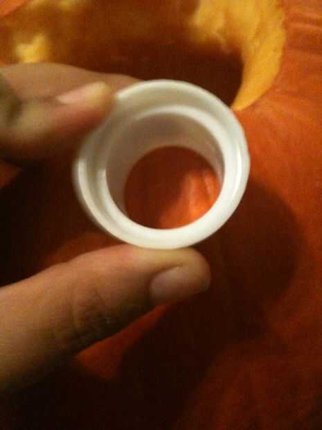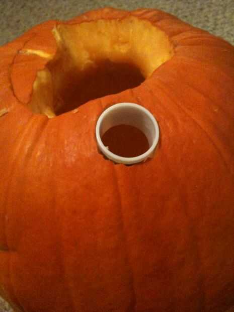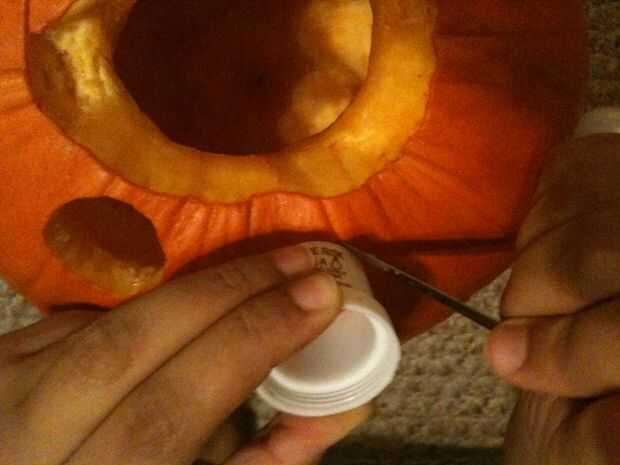 Por último, corte un orificio de acceso en la parte superior trasera de la calabaza para los cables. También hice mío lo suficientemente grande como para sujetar el zócalo de la bombilla que iluminará el interior de la calabaza sí mismo como una vela no será una opción debido a mi tomas y cableado interior de la calabaza.