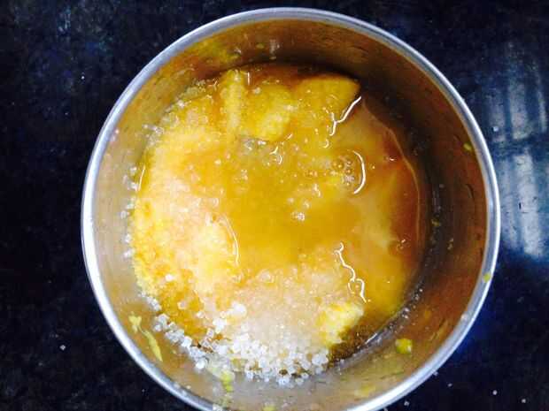 Cortar el limón en la mitad y exprime el limón para conseguir el jugo de limón a la pulpa de mango. Luego agregar cuarto taza de azúcar y taza de cuarta dejar para próximos pasos.