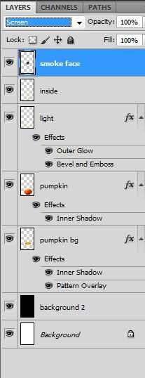 Coloque la capa de humo entre la capa de "calabaza bg" y la "calabaza", para que se vea como si el humo está saliendo de la calabaza. ahora Localice la cara humo"capa justo por encima de la capa de humo real como parte del humo.