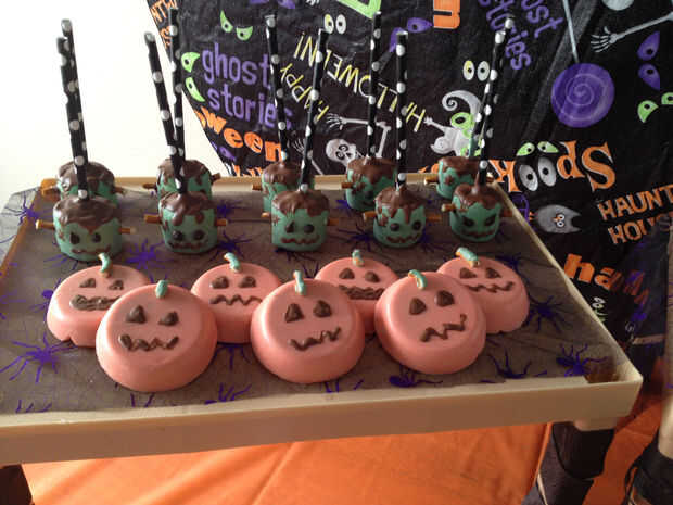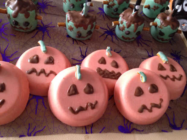 Derretir los chips de chocolate, verter en la bolsa de ziplock, cortar el extremo y tubo ojos y sonrisa asustadiza