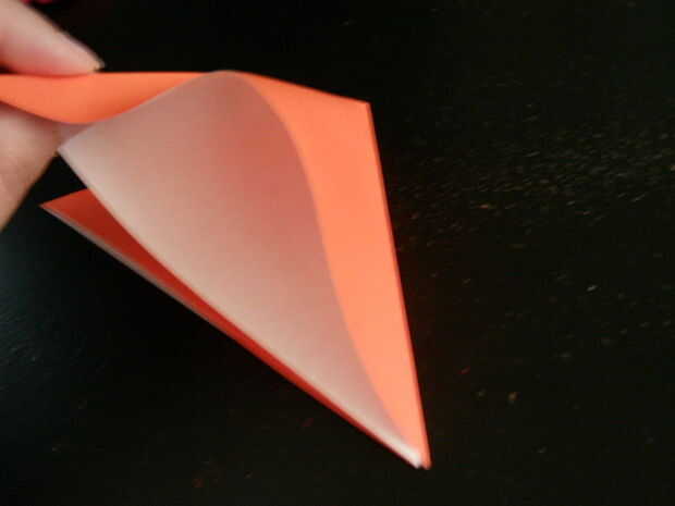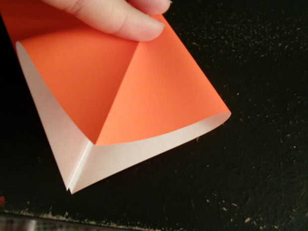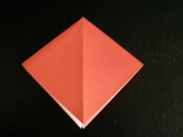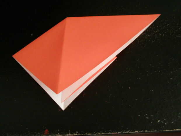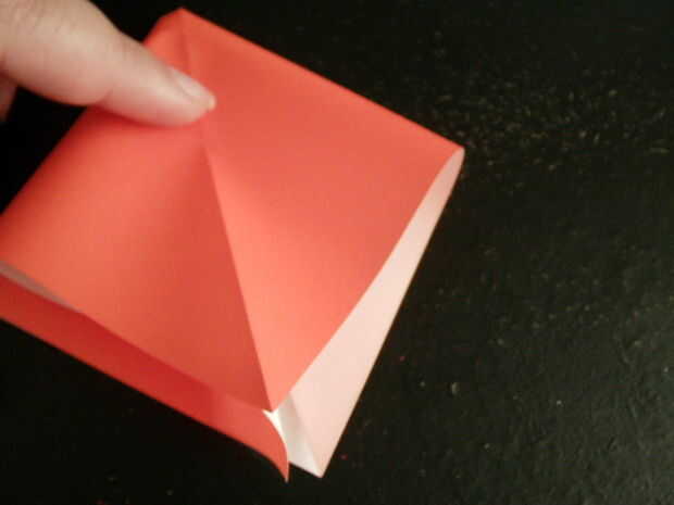 Ahora abrir uno de los bolsillos y smoosh hacia abajo hasta formar una forma de diamante. Repetir en la parte posterior. Se trata de la misma base que al hacer una grúa.